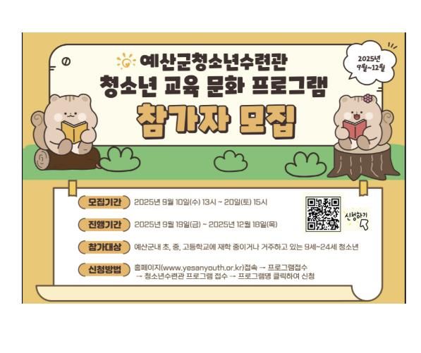내고향뉴스 관리자 기자 | 예산군청소년수련관은 관내 청소년들의 건강한 성장 지원과 미래 사회 대비를 위해 마련된 2025년 4분기 청소년 프로그램 참가자를 9월 10일 오후 1시부터 20일 오후 3시까지 모집한다고 밝혔다.