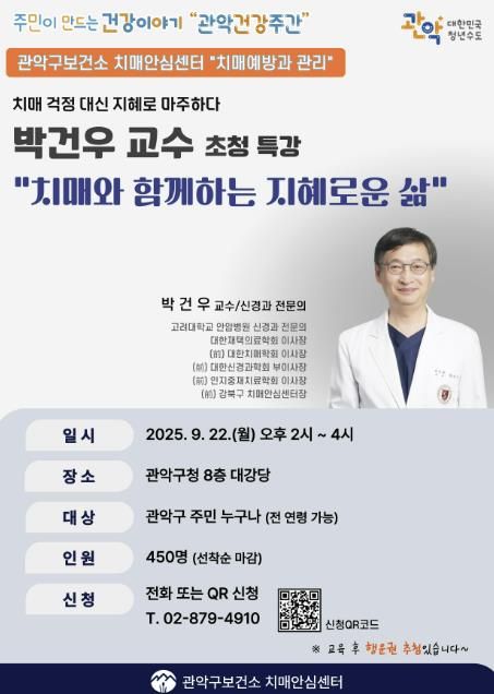 이번 특강은 고려대학교 안암병원 신경과 박건우 교수를 초청해 ‘치매와 함께하는 지혜로운 삶’이라는 주제로 치매의 예방과 관리방법 등을 주민들이 알기 쉽게 강연한다.