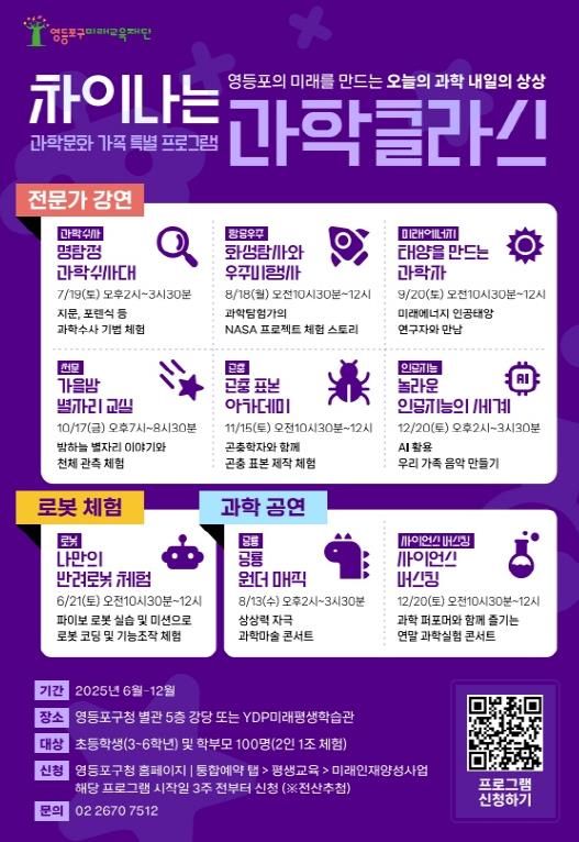 영등포구 미래교육재단 관계자는 “자녀 진로 설계에 필요한 전문 지식을 얻고 생활 속에서 과학을 즐기는 기회가 될 것”이라며 “앞으로도 시대 흐름에 맞는 다양한 프로그램을 통해 구민 모두가 함께 성장할 수 있도록 지원하겠다”라고 전했다.