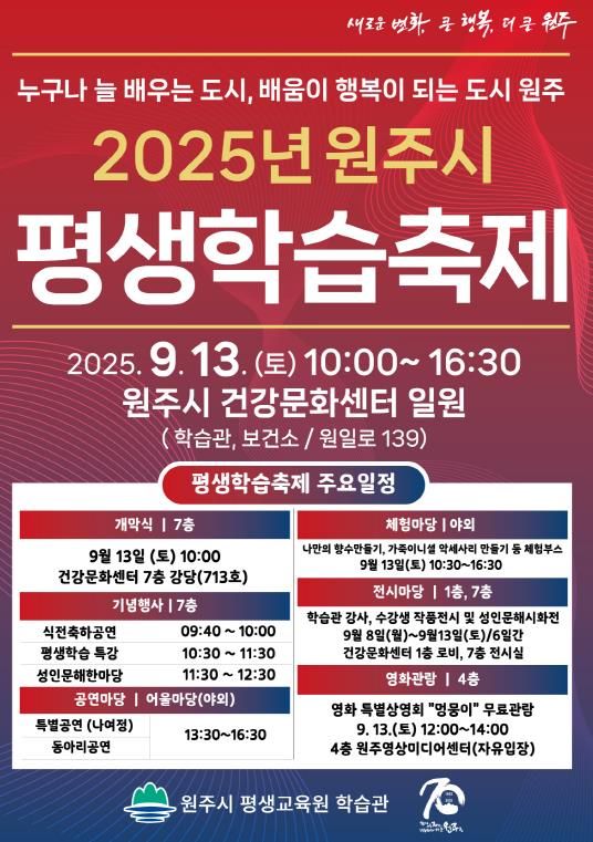 내고향뉴스 관리자 기자 | 원주시 평생교육원 학습관은 오는 13일 건강문화센터 일원에서 ‘누구나 늘 배우는 도시, 배움이 행복이 되는 도시 원주!’를 주제로 ‘2025년 원주시 평생학습축제’를 개최한다.