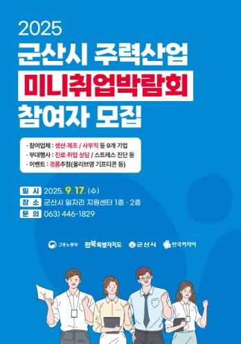 내고향뉴스 고광만 기자 | 군산시가 오는 9월 17일 군산시 일자리 지원센터(구영7길 129, 영화동)에서 열리는 ‘군산시 주력산업 미니 취업 박람회’에 참여할 구직자를 모집한다.