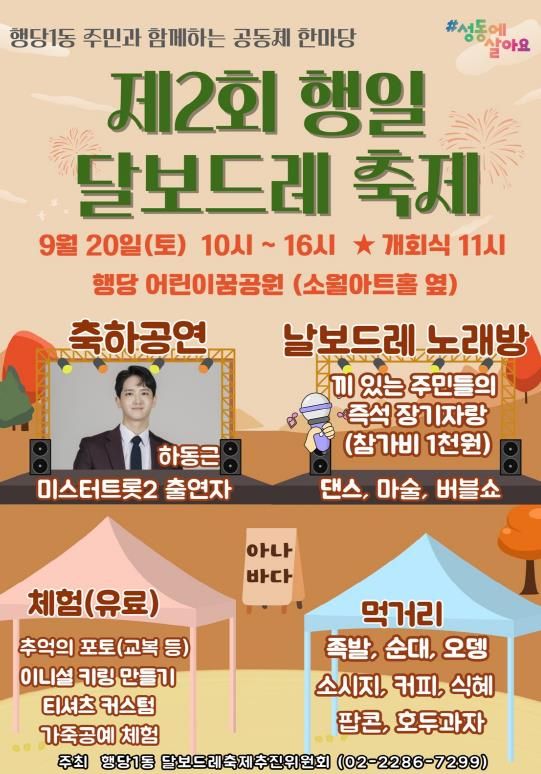 내고향뉴스 관리자 기자 | 서울 성동구 행당제1동은 오는 20일 행당 어린이꿈공원에서 ‘제2회 행일 달보드레 축제’를 개최한다고 밝혔다.