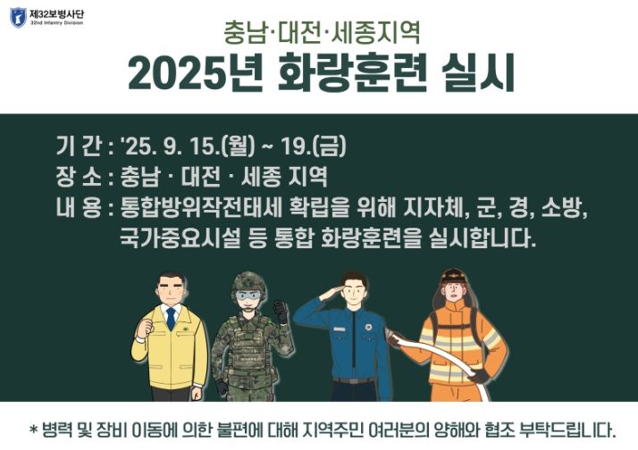 내고향뉴스 관리자 기자 | 육군 제32보병사단은, 오는 9월 15일부터 9월 19일까지 충남ㆍ대전ㆍ세종 지역에서 화랑훈련을 한다고 밝혔다.