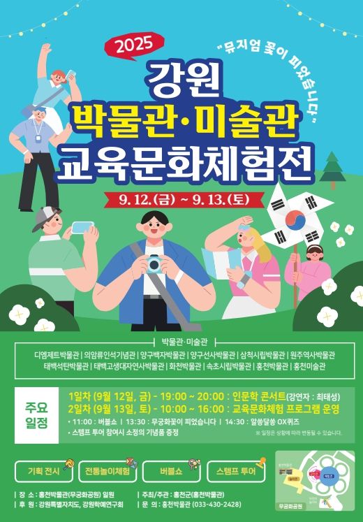 내고향뉴스 관리자 기자 | 강원도의 대표 박물관·미술관 12곳이 참여해 오는 9월 13일 홍천박물관 야외마당에서 '강원 박물관·미술관 교육문화체험전'을 개최한다.