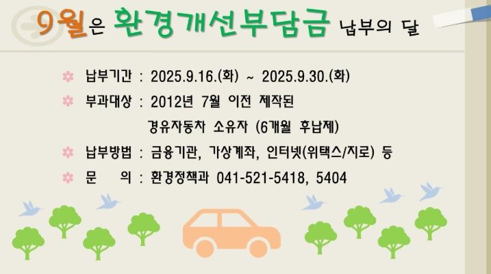 내고향뉴스 관리자 기자 | 천안시는 경유자동차 1만 3,000여 대에 대해 2025년 2기분 환경개선부담금 6억 9,000만 원을 부과한다고 10일 밝혔다.