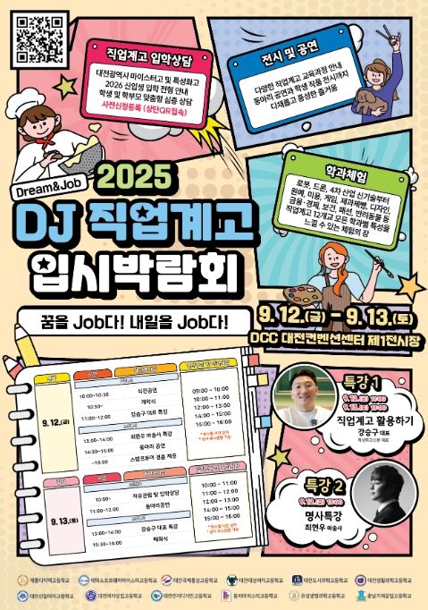 내고향뉴스 관리자 기자 | 대전시교육청은 9월 12일부터 9월 13일 양일간 오전 9시부터 오후 16시까지 대전컨벤션센터(DCC) 제1전시장에서 “꿈을 Job다! 내일을 Job다!”라는 주제로 ‘2025 DJ(Dream&Job) 직업계고 입시박람회’를 실시한다고 밝혔다.