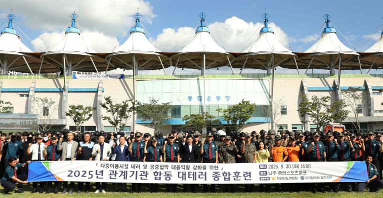 내고향뉴스 채필재 기자 | 전남경찰청은 나주종합스포츠파크에서 국가정보원(광주지부), 육군 제31보병사단, 제11공수특전여단, 공군 제1전투비행단, 전남소방본부, 영산강유역환경청 등 10개 기관 250여명이 참여한 가운데 관계기관 합동 대테러 종합훈련을 실시했다.