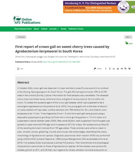 이 결과 국내에서는 처음으로 체리에서 발생한 혹병(Agrobacterium larrymoorei)이 규명돼 국제 학술지(Plant Disease)에 보고됐다.