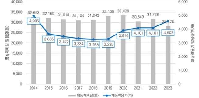 2023년 기준 경기도 영농폐기물 발생량은 영농 폐비닐이 약 3만 톤(93%), 폐농약 용기가 약 460만 개(94%)로 나타났다.