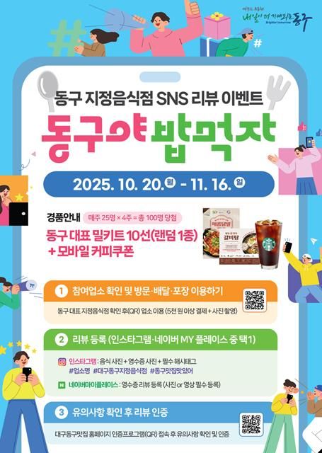 내고향뉴스 박성환 기자 | 대구 동구청은 지정음식점 홍보와 외식산업 활성화를 위해 20일부터 11월 16일까지 4주간 ‘동구 지정음식점 홍보 SNS 인증샷 & 리뷰 이벤트’를 실시한다.