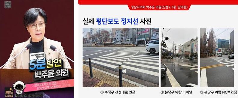 내고향뉴스 김익성 기자 | 성남시의회 박주윤 의원(국민의힘, 신흥2·3동·단대동)은 12월 18일 열린 제307회 성남시의회 제3차 본회의 5분 발언에서 보행자의 생명과 직결된 ‘횡단보도 정지선 이격거리 확대 설치’의 시급성을 강조하며, 성남시의 적극적인 개선책 마련을 촉구했다.