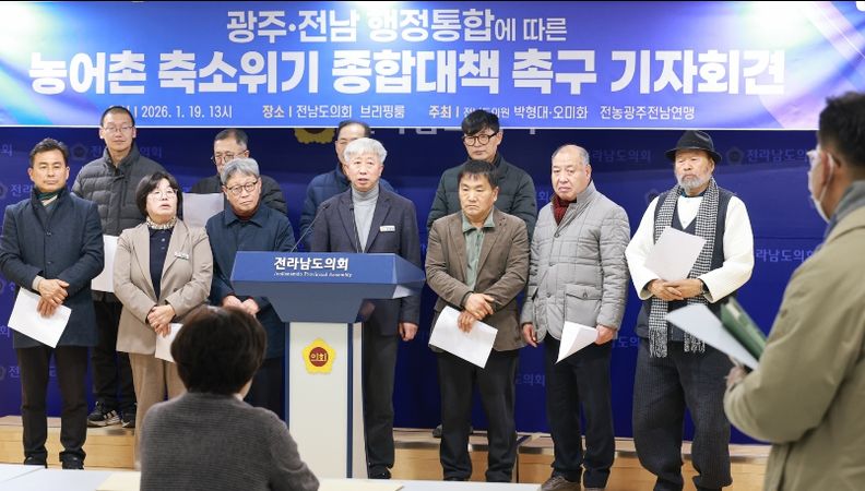 내고향뉴스 김익성 기자 | 전라남도의회 박형대 의원(진보당·장흥1)은 1월 19일 도의회 브리핑룸에서 기자회견을 열고 “광주ㆍ전남 행정통합 논의가 속도를 내고 있지만 농어촌 축소 위기에 대한 대비는 현저히 부족하다”며 농어촌 보호를 위한 구체적 합의를 요구했다.