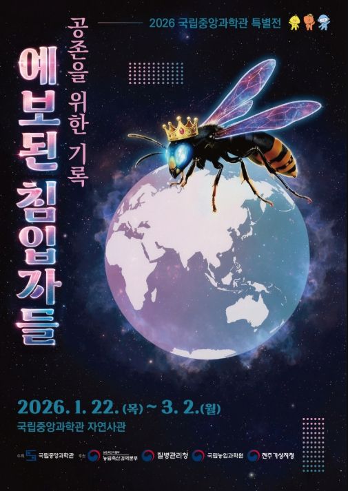 내고향뉴스 김익성 기자 | 미래의 꿈을 만드는 과학기술 문화 이음터(플랫폼) 과학기술정보통신부 국립중앙과학관은 1월 22일부터 3월 2일까지 자연사 관에서 인공지능(AI) 기술을 활용해 다양한 기후변화에 따른 해충의 위협과 슬기로운 대응을 다룬 해충특별전 ‘2026년 예보된 침입자들: 공존을 위한 기록’을 개최한다고 밝혔다.