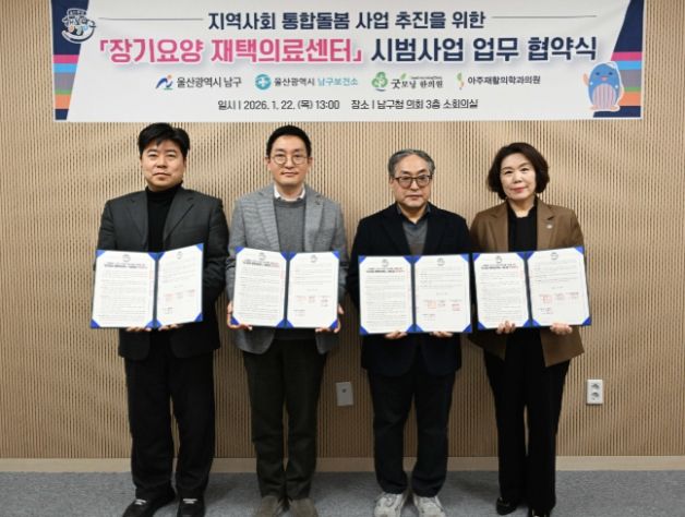내고향뉴스 김익성 기자 | 울산 남구는 지역 내 거동불편 어르신들의 건강한 재가생활 지원을 위해 22일 남구청에서 굿모닝한의원, 아주재활의학과의원, 보건소 등과 ‘장기요양 재택의료센터’ 시범사업 업무협약식을 개최했다.