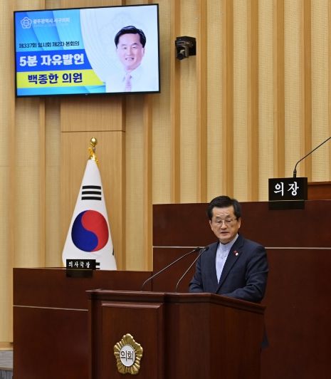 내고향뉴스 김익성 기자 | 광주 서구의회 백종한 의원(화정3동, 화정4동, 풍암동)이 23일 제337회 임시회 제2차 본회의에서 5분자유발언을 통해 재난·안전·민생·복지 현장에서 근무해 온 공직자들의 노고를 치하했다.