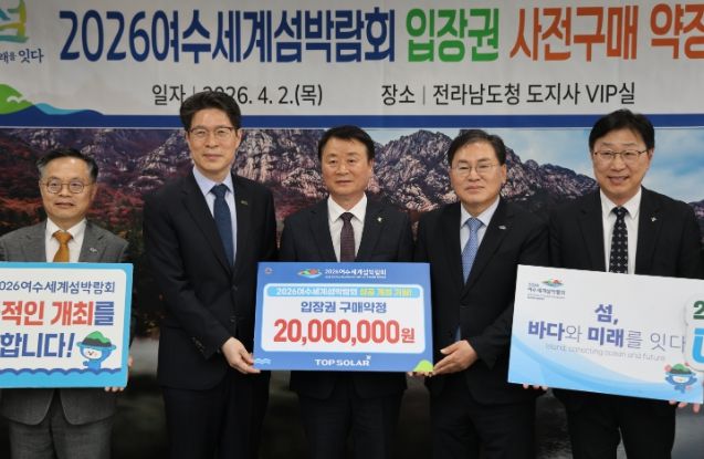 내고향뉴스 김명신 기자 | (재)2026여수세계섬박람회조직위원회는 4월 2일 전남도청 VIP실에서 탑솔라㈜와 ‘2026여수세계섬박람회 입장권 구매약정식’을 개최했다고 밝혔다.