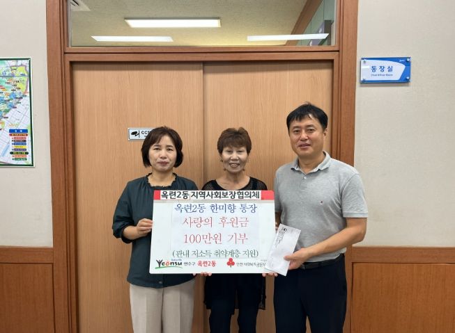 내고향뉴스 관리자 기자 | 연수구 옥련2동 한미향 통장이 지난 28일 저소득, 홀몸 어르신 등 도움이 필요한 저소득 취약계층을 위해 써달라며 동 지역사회보장협의체(위원장 김영미·박인규)에 100만 원을 전달했다.