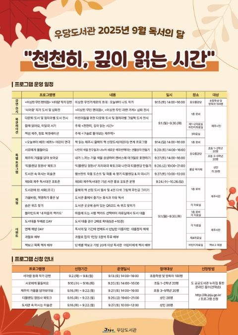 내고향뉴스 관리자 기자 | 제주시 우당도서관은 제주의 가을, 바람처럼 스며드는 책 향기가 시민들의 일상에 머무를 수 있도록 오는 9월 특별한 한 달을 준비했다.