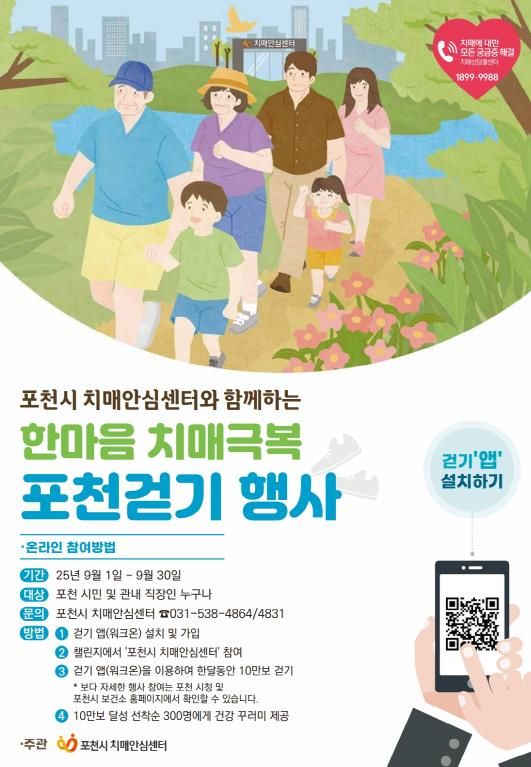 한편, 포천시는 걷기 행사와 함께 오는 9월 5일 CGV 포천에서 제18회 치매극복의 날을 기념하는 치매극복 주간 문화 행사도 개최한다. 이날 행사에서는 홍보부스 운영, 인식 개선 캠페인, 영화 관람 등 다양한 프로그램을 통해 치매 친화적 지역사회 조성에 앞장설 계획이다.