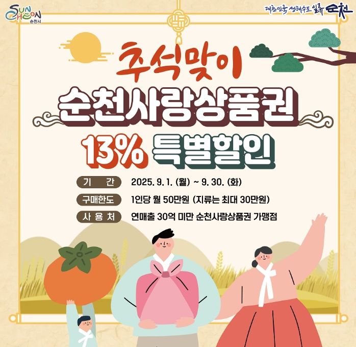 내고향뉴스 관리자 기자 | 순천시는 추석명절을 맞아 9월 한 달간 순천사랑상품권 13% 특별할인 판매를 실시한다고 밝혔다.