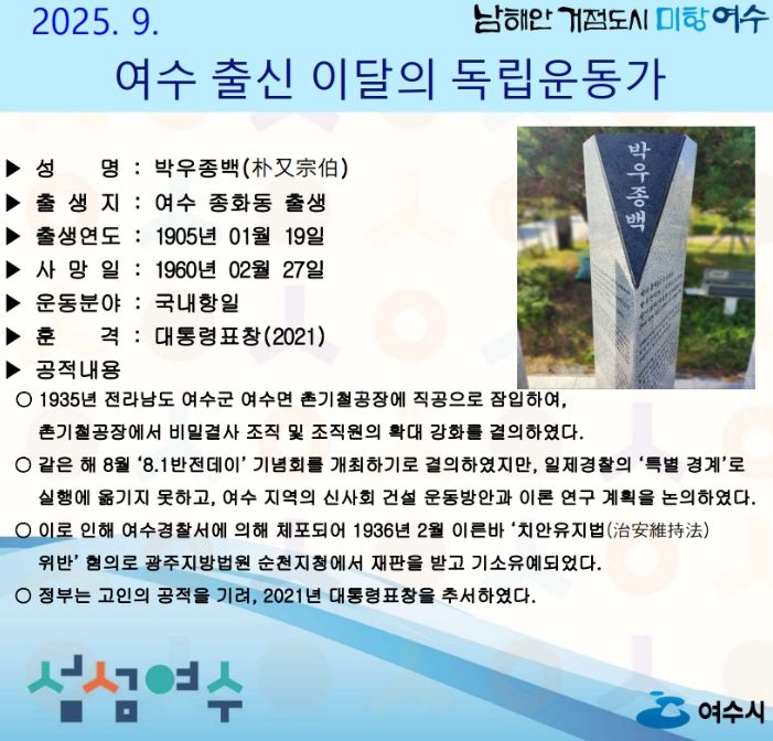 내고향뉴스 관리자 기자 | 여수시는 전라남도 여수 종화동 출신의 ‘박우종백(朴又宗伯)’ 선생을 2025년 9월의 독립운동가로 선정했다.