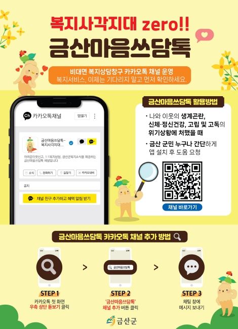 이용 방법은 카카오톡 실행 후 검색창에 ‘금산마음쓰담톡’을 입력해 채널 추가하고 메시지를 입력하면 된다.