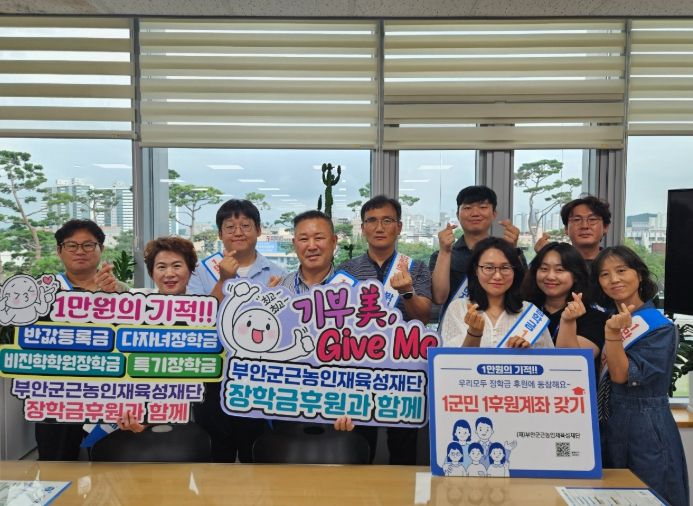 한편, 부안군근농인재육성재단은 반값등록금, 다자녀장학금, 특기장학금, 대학 비진학자 취업‧창업 학원비 지원 등 다양한 장학사업을 통해 지역청년들에게 희망을 전하고 있으며, ‘장학금 1군민 1후원계좌 갖기’ 운동을 통해 군민 모두가 후원자가 되는 나눔 문화를 확산해 나가고 있다.