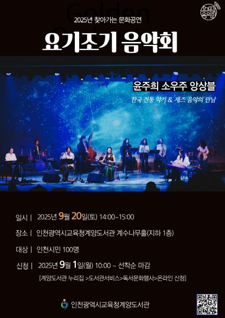 내고향뉴스 관리자 기자 | 인천광역시교육청계양도서관은 오는 9월 20일 오후 2시 계수나무홀에서 ‘2025년 찾아가는 문화공연 요기조기 음악회’를 개최한다.