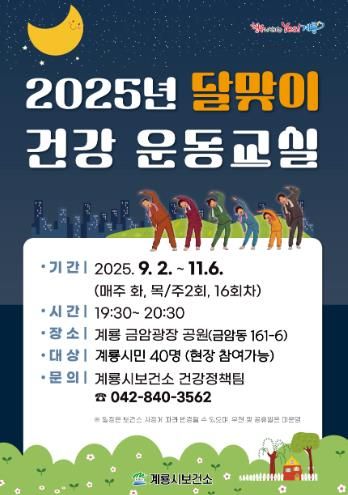 내고향뉴스 관리자 기자 | 계룡시는 오는 9월 2일부터 11월 6일까지 매주 화·목 저녁 7시 30분부터 8시 30분까지 금암광장 공원에서 시민과 함께하는 ‘2025 달맞이 건강 운동교실’을 운영한다고 밝혔다.