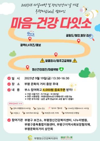 내고향뉴스 관리자 기자 | 부평구 부평정신건강복지센터는 오는 19일 부평 문화의 거리 중앙무대에서 2025년 자살예방 및 정신건강의 날 기념 ‘부평마음We로(路) 캠페인 마음-건강 다잇소’를 진행한다.