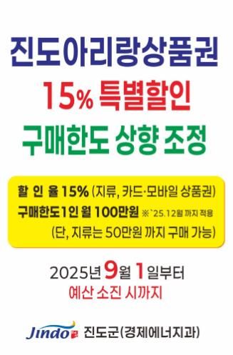 내고향뉴스 관리자 기자 | 진도군은 추석 명절을 맞아 지역경제를 활성화하기 위해 9월 1일부터 진도아리랑상품권을 15% 특별 할인 판매하고, 12월까지 구매 한도를 상향 조정한다고 밝혔다.