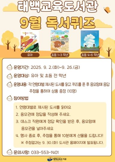 내고향뉴스 관리자 기자 | 태백교육도서관은 9월 2일부터 26일까지 유아 및 초등학생을 대상으로 ‘9월 독서퀴즈’ 프로그램을 운영한다.