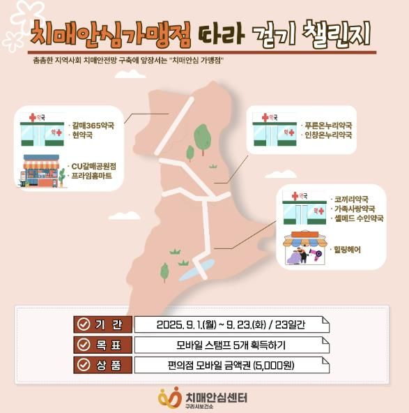 내고향뉴스 관리자 기자 | 구리시는 오는 9월 1일부터 23일 동안 ‘치매안심가맹점 따라 걷기 스탬프 챌린지’를 운영한다.
