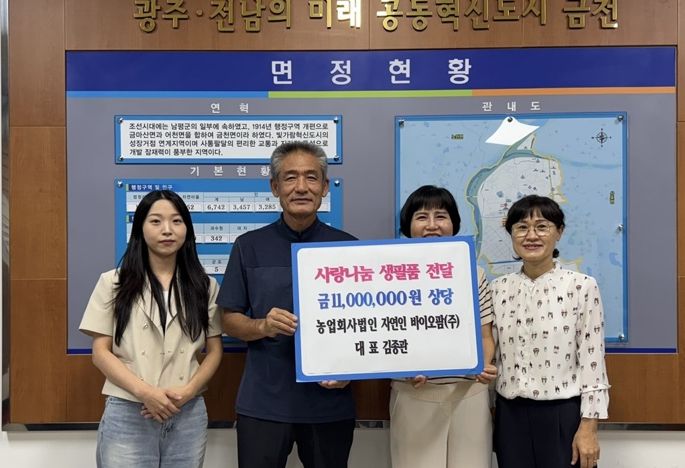 내고향뉴스 관리자 기자 | 전라남도 나주시 금천면은 관내 농업회사법인 자연인 바이오팜(주) 김종관 대표가 지난 26일 지역사회 취약계층을 위한 생필품을 기탁했다고 밝혔다.
