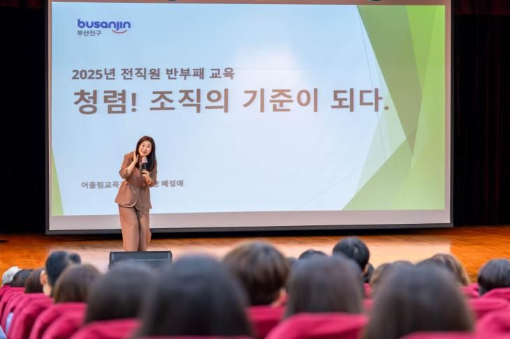 내고향뉴스 고광만 기자 | 부산진구는 지난 8월 28일 청렴연수원 전문강사 배정애 강사를 초청해 전 직원을 대상으로 『2025년 직원청렴특강』을 실시했다.