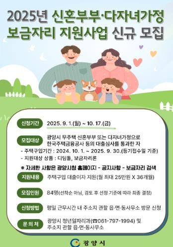 내고향뉴스 고광만 기자 | 광양시는 주택 마련에 따른 경제적 부담을 덜고 출산·양육하기 좋은 환경을 조성하기 위해 ‘2025년 신혼부부·다자녀가정 보금자리 지원사업’ 대상자 84가구를 9월 1일부터 10월 17일까지 모집한다고 밝혔다.