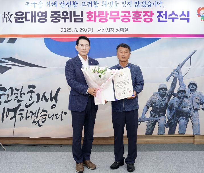 이날 전수식에서 이완섭 서산시장은 고(故) 윤대영 중위의 조카사위 고기영 씨에게 화랑무공훈장과 함께 감사의 마음을 전했다.