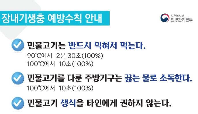 장내기생충 감염병을 예방하기 위해서는 ▲민물고기를 날것으로 먹지 않고 익혀서 먹기(90℃에서 2분 30초, 100℃에서 10초) ▲민물고기를 다룬 칼, 도마 등 조리 기구는 열탕 소독(100℃에서 10초) ▲민물고기 생식을 타인에게 권하지 않기 등의 예방 수칙을 지켜야 한다.