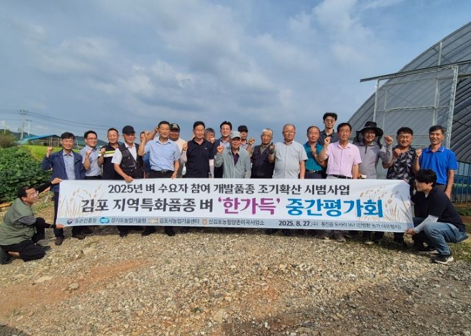 내고향뉴스 고광만 기자 | 김포시농업기술센터는 지난 8월 27일 통진읍 도사리 일원에서 ‘벼 수요자 참여 개발품종 조기확산 시범사업’의 일환으로 농업인 및 관계자 30여 명이 참여한 가운데 김포 지역특화 벼 신품종인 ‘한가득’의 중간평가회를 실시했다.