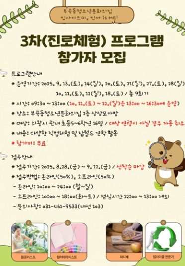 참가자 접수 기간은 8월 29일부터 9월 12일까지이며, 신청 방법과 세부 내용은 부곡동청소년문화의집 홈페이지 공지사항을 확인하거나, 유선으로 문의하면 안내받을 수 있다.