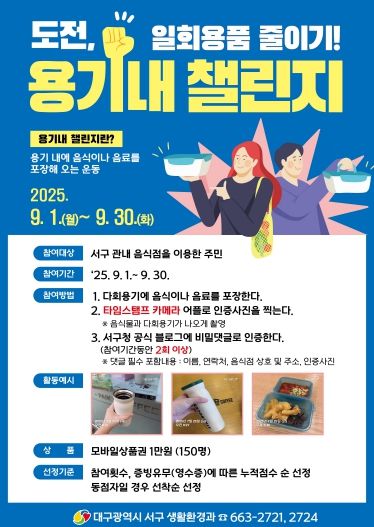 내고향뉴스 고광만 기자 | 대구 서구청은 주민과 함께 일회용품 사용을 줄이고 자원 재활용 문화를 확산하기 위해 오는 9월 한 달 동안 『용기내챌린지』를 실시한다.