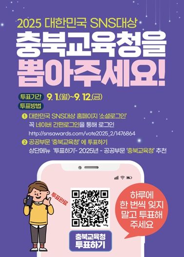 내고향뉴스 채필재 기자 | 충청북도교육청이 '제15회 대한민국 SNS 대상' 공공부문 본선에 진출하며 첫 대상에 도전장을 내밀었다.