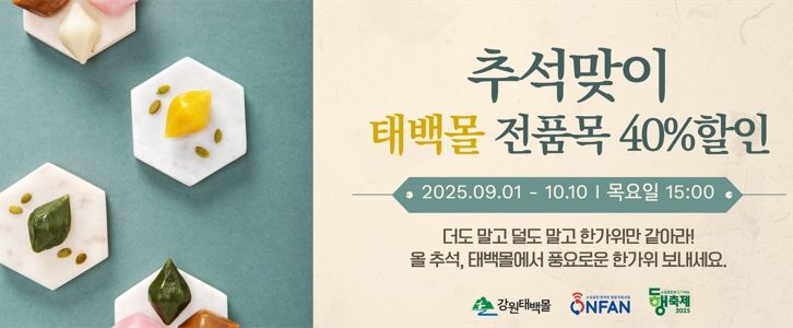 내고향뉴스 채필재 기자 | 태백시는 지역 중소기업 온라인 쇼핑몰인 ‘강원태백몰’에서 9월 1일부터 10월 10일까지 40일간 ‘추석맞이 특별 기획전’을 진행한다고 밝혔다.