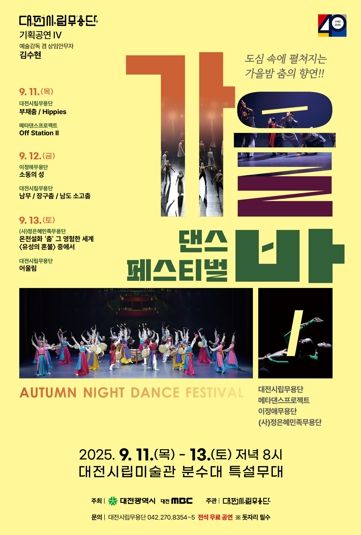 내고향뉴스 채필재 기자 | 대전시립무용단은 오는 9월 11일부터 13일까지 사흘간 오후 8시, 대전시립미술관 분수대 특설무대에서 제24회 기획공연 ‘가을밤 댄스 페스티벌’을 개최한다. 올해 공연은 시립무용단 창단 40주년을 기념해 지역의 대표 무용단들과 함께 꾸며지며, 시민 누구나 무료로 관람할 수 있다.