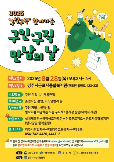 내고향뉴스 채필재 기자 | 경주시는 지난 29일 경주시근로자종합복지관에서 ‘2025 구석구석 찾아가는 구인·구직 만남의 날’ 채용행사를 열고 지역 구직자들에게 실질적인 취업 기회를 제공했다고 밝혔다.
