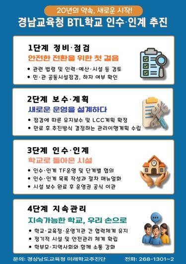 내고향뉴스 채필재 기자 | 경상남도교육청은 임대형민자사업(BTL) 방식으로 운영해 온 도내 124개 학교의 20년 임대 운영 기간이 2027년부터 순차적으로 종료됨에 따라, 학교 시설의 공공성을 회복하고 지속 가능한 운영 체계를 마련하기 위해 본격적인 인수인계 절차에 들어갔다고 밝혔다.