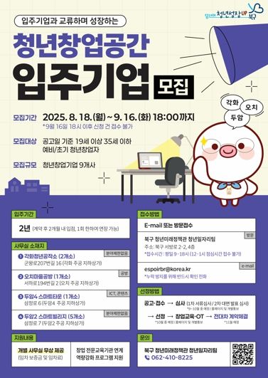 입주자 선발은 서류 심사와 발표심사를 거쳐 10월 중 최종 결정될 예정이며 입주 청년에게는 공간 제공을 넘어 창업 전문 교육기관 프로그램 연계, 전문가 컨설팅 및 멘토링 지원 등을 통해 안정적으로 창업 역량을 키울 수 있는 기회가 제공될 방침이다.
