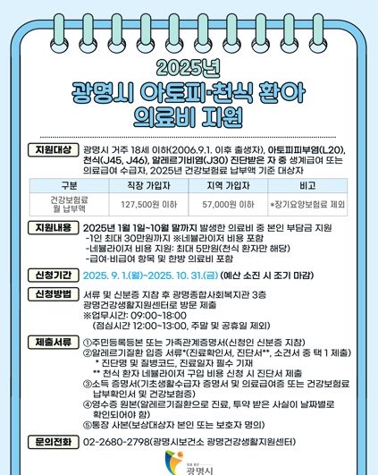 지원 대상은 광명시에 거주하는 18세 이하(2006년 9월 1일 이후 출생자) 아동·청소년 중 아토피 피부염(L20), 천식(J45·J46), 알레르기비염(J30) 중 하나 이상 진단 받은 자다.