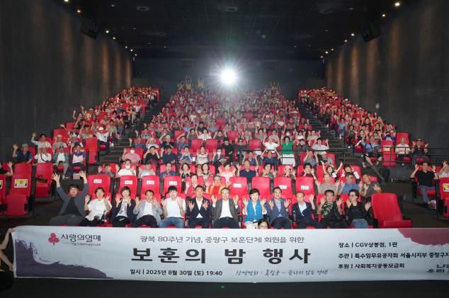 내고향뉴스 고광만 기자 | 중랑구는 광복 80주년을 기념해 지난 8월 30일 CGV 상봉점에서 보훈단체 회원 320여 명을 초청해 ‘보훈의 밤 [보훈단체 영화 관람] 행사’를 개최했다. 이번 행사는 광복의 역사적 의미를 함께 되새기고, 보훈가족에게 감사와 예우를 전하고자 마련됐다.