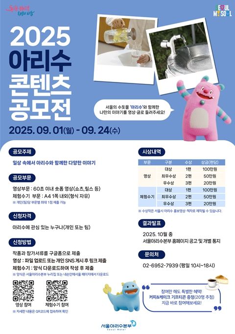 이회승 서울아리수본부장은 “아리수는 안전한 수질과 시민 건강, 환경적 가치를 두루 갖춘 우수한 수돗물”이라며, “이번 공모전을 통해 시민들이 아리수와 함께한 일상을 공유하고, 그 가치를 더 많은 사람들과 나누는 계기가 되기를 기대한다.”고 말했다.